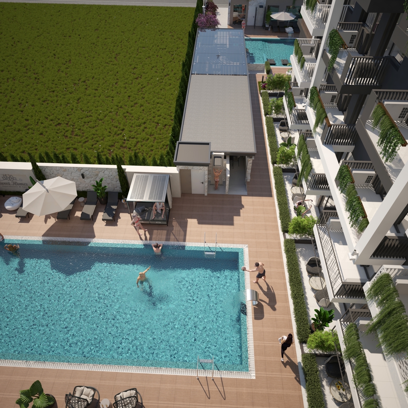На территории предусмотрен бассейн и зона отдыха с озеленением. Для удобства жильцов в здании установлен лифт. Территория закрытая и ухоженная, что обеспечивает приватность и безопасность.