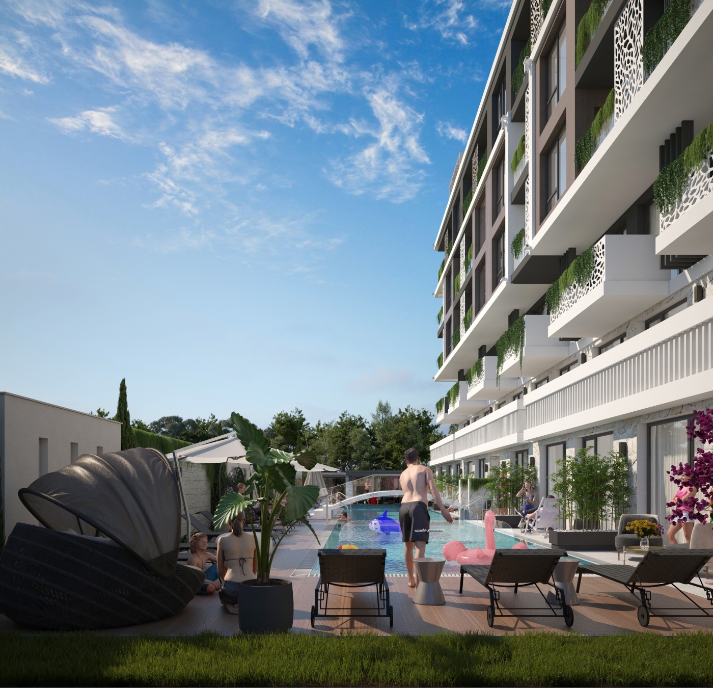 На благоустроенной территории расположены бассейн с зоной отдыха, сауна, джакузи, зона барбекю, детская площадка и охраняемая парковка. Архитектура и дизайн Sweet Homes 9 выполнены в узнаваемом стиле бренда, где особое внимание уделено гармонии форм, свету и эстетике пространства.