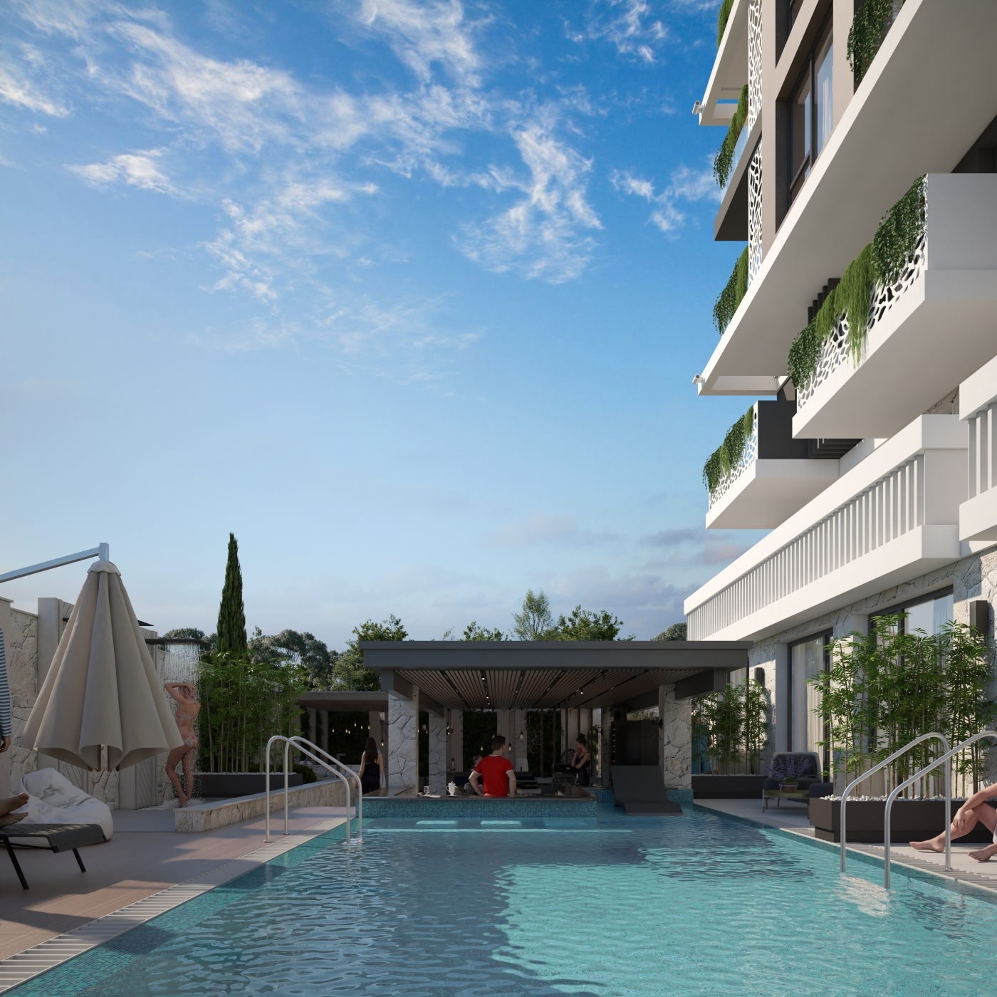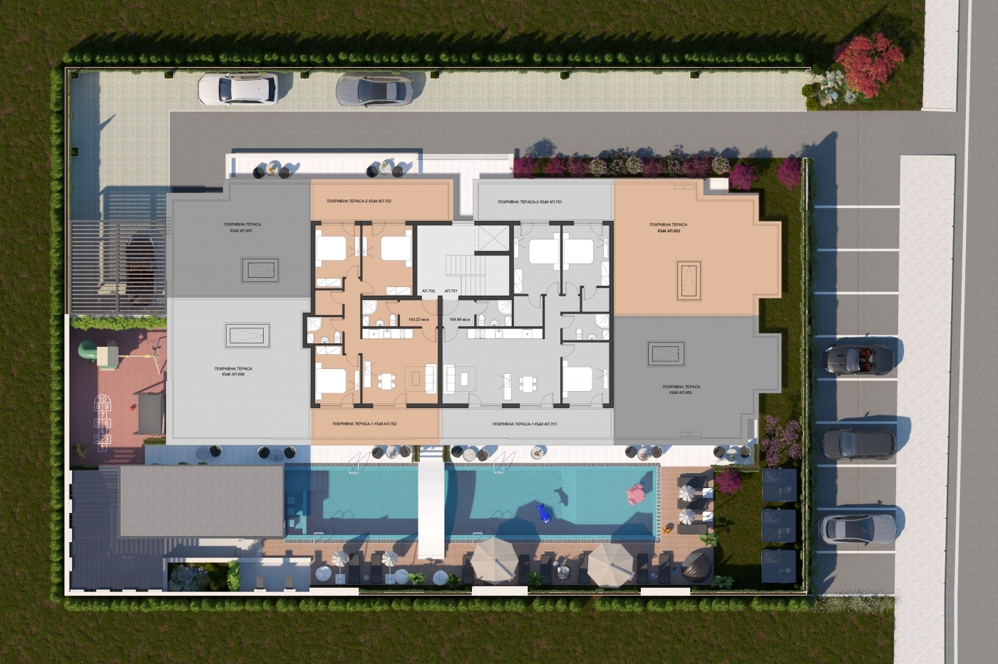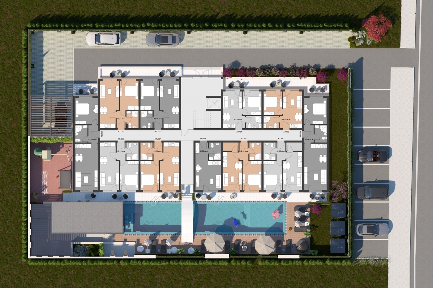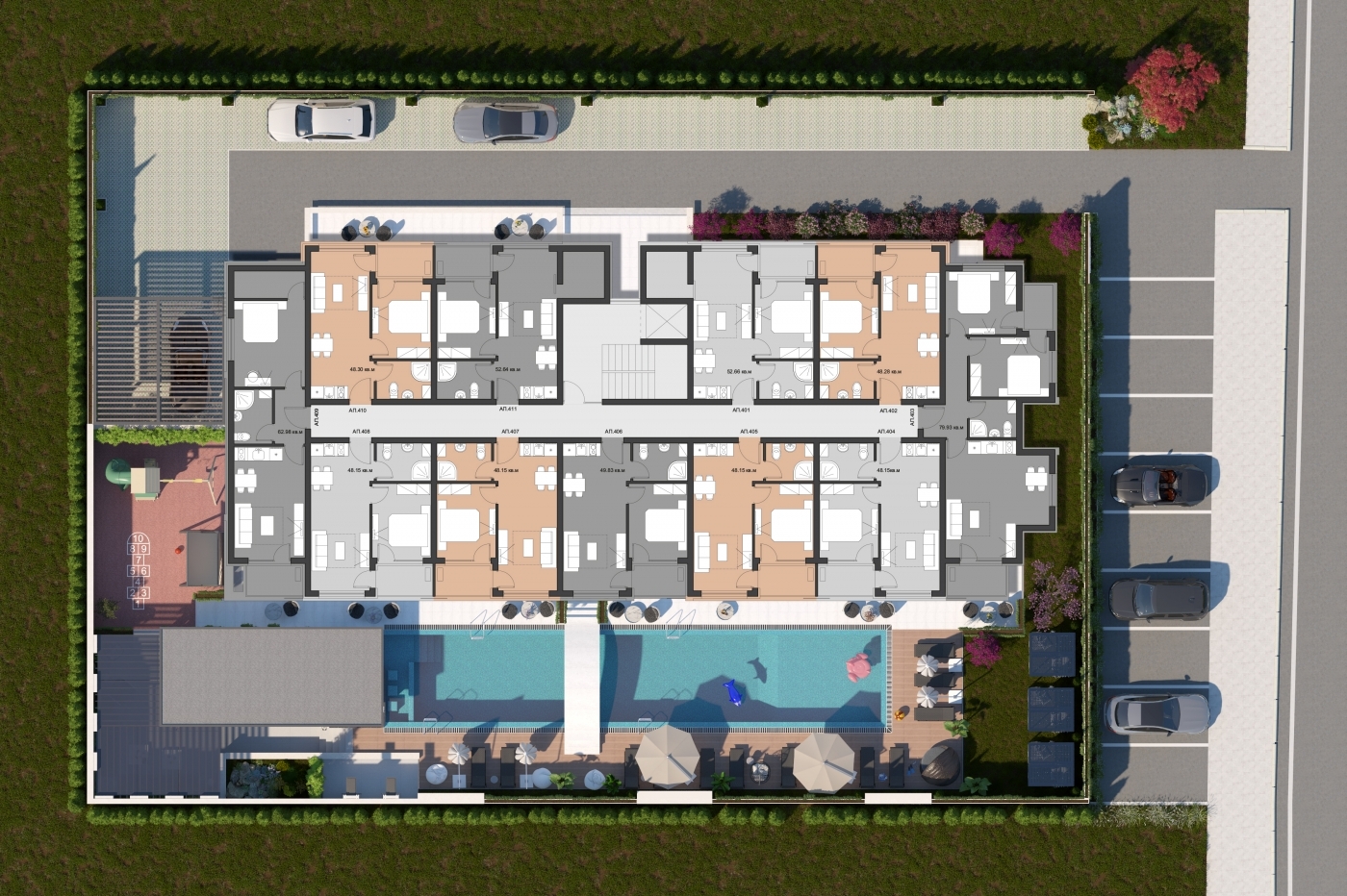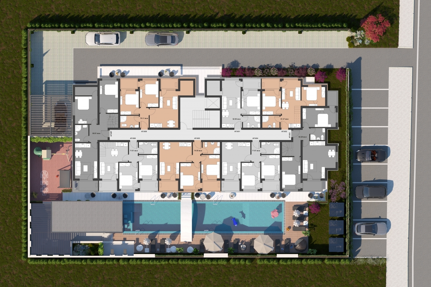 Комплекс расположен в центральной и при этом тихой части курорта, в окружении зелени и в пешей доступности от пляжа. Такое расположение позволяет наслаждаться спокойствием и уединением, оставаясь рядом с магазинами, кафе, ресторанами и другой курортной инфраструктурой. Район отличается удобной транспортной доступностью и развитой городской средой.